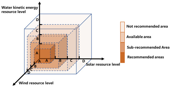 By incorporating the hydropower resource classification as a third dimension into the two-dimensional screening model, a three-dimensional site evaluation framework is established, as shown in Figure 3:
