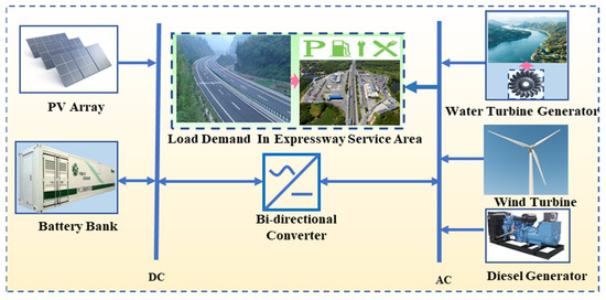 Based on the site selection analysis presented in Section 2.1, a renewable hybrid energy system is designed for the target expressway region by integrating wind, solar, and hydropower resources. Due to the intermittent and variable nature of solar and wind energy, the power output from photovoltaic panels, wind turbines, and hydrokinetic generators is inherently unstable. To ensure a reliable and continuous electricity supply, a diesel generator is incorporated as a backup power source. Batteries are included to store excess energy and stabilize voltage at the load terminals, while converters are used to manage power conversion between AC and DC systems. The schematic diagram of the expressway wind/solar/hydropower hybrid energy system is illustrated in Figure 4 below: