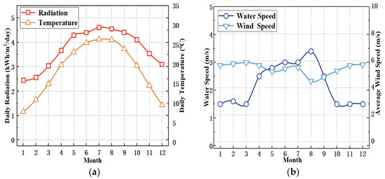 Data on solar radiation, air temperature, wind speed, and river flow velocity in the case area. (a) Solar Irradiance and Ambient Temperature. (b) Wind Speed and River Flow Velocity.