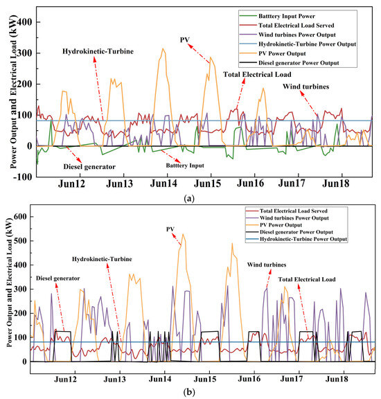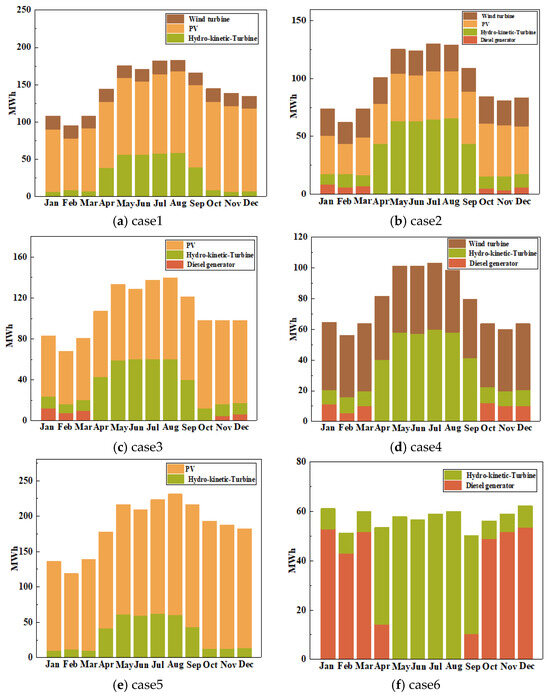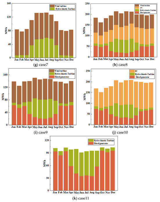 The power generation results of 11 different hybrid energy system configurations are illustrated in Figure 7a–k. Each subplot shows the percentage contribution of various power generation devices—solar PV, wind turbines, hydrokinetic turbines, diesel generators, and batteries—within each configuration. The electricity generated by each system serves two primary purposes: supplying power to meet the load demand and storing surplus energy when generation exceeds demand.