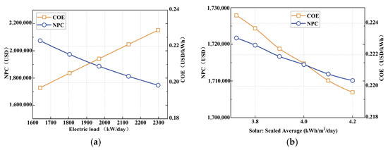 Effects of load and radiation on NPC and COE in the study area. (a) Load change. (b) Solar radiation change.
