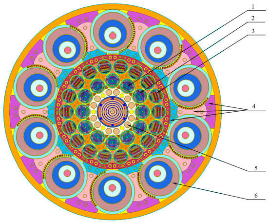 Cross section of the IVG.1M research reactor (RR). 1: Water-cooled technological channel (WCTC) of the 1st row; 2: WCTC of the 2nd row; 3: WCTC of the 3rd row; 4: reflector; 5: reactivity compensation rods; 6: control drums (CD).