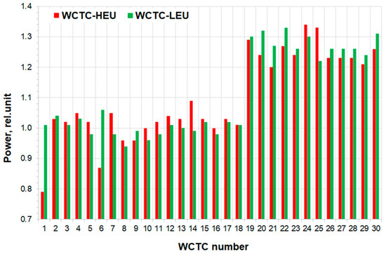 Figure 2 shows the relative power distribution across the rows of WCTCs, obtained by normalizing the power value of each WCTC to the average power of the third-row WCTCs. For comparison, Figure 2 also presents a similar distribution for HEU fuel. The data for the HEU fuel were obtained from experiments conducted from 2017 to 2020, during which two experimental WCTCs-LEU were placed in core cells 14 and 24. The standard deviation of the relative power distribution for LEU WCTCs did not exceed 0.03. For HEU fuel, the standard deviation was ~0.045 for the first and second rows and 0.07 for the third row. It is noteworthy that for HEU fuel, the power in WCTCs #1 and #6 was systematically lower than the row average. It can be assumed that the 235U fissile isotope content in these two channels was most likely lower than in other channels of this row. Overall, the power distribution became more uniform after the fuel replacement.