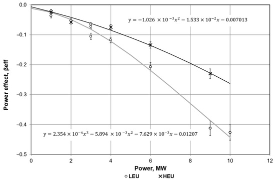 As shown in Table 5, the PRE is negative throughout the reactor power range. Figure 3 shows the experimental dependence of the reactivity effect on reactor power for LEU and HEU fuels. In comparison with the HEU fuel data, the power reactivity effect is more pronounced: at a power level of 9 MW, the effect increased by more than 1.5 times, which is attributed to the greater 238U content and the enhanced Doppler effect.