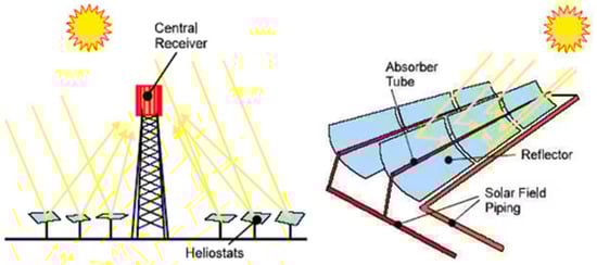 Currently, scalable CSP systems mainly include tower and trough systems (Figure 2), both of which can use molten salt as the heat transfer medium [40,41]. Key components of a CSP system include heliostats, receiver, thermal energy storage tanks, and a power generation system, shown in Figure 3.