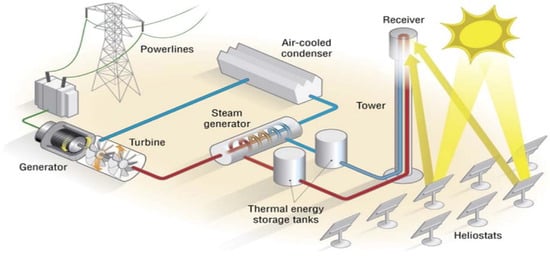 Schematic diagram of the operation of a tower-type solar thermal power plant [42].
