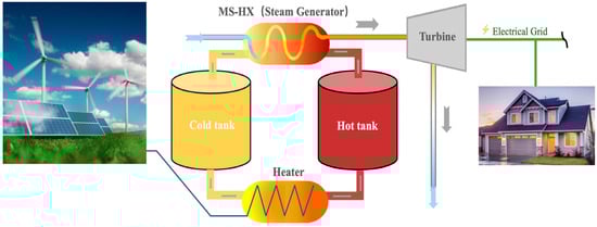 Additionally, it can store industrial waste heat and other forms of energy (Figure 4) [48]. Industrial waste heat and other thermal energy sources can be directly absorbed by molten salt. In contrast, photovoltaic or wind power must first be converted into thermal energy through a molten salt electric heater. The heated molten salt then flows into the high-temperature storage tank, completing the energy storage process. During power demand, the high-temperature molten salt is used to evaporate water into steam via a preheating heat exchanger. The steam subsequently passes through a superheater heat exchanger, where molten salt further heats it to control the dryness fraction, ensuring the steam meets the requirements for efficient Rankine cycle operation. When the molten salt temperature exceeds 500 °C, carbon dioxide can serve as an efficient working fluid, with its high density and low viscosity characteristics further enhancing the thermal-to-electric conversion efficiency.