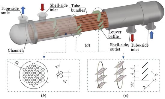 Common shell and tube heat exchanger physical diagram: (a) Three-dimensional of STHE-LV (b) Tube bundle layout (c) Louver baffles [73].