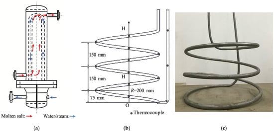 In parallel, improvements to shell-and-tube MS-HXs have been experimentally verified through the tube-side optimizations. For instance, Ding et al. [96] developed a U-tube bundle heat exchanger, which improved molten salt heat transfer efficiency by optimizing flow distribution, and identified the optimal inlet temperature and velocity. In a subsequent study [97], the same team designed a coiled-tube steam generator (Figure 10), achieving over 90% thermal efficiency under optimized molten salt temperature and water flow conditions. They further demonstrated that forced convection of molten salt increases the overall heat transfer coefficient but also raises heat loss. Jiang et al. [98] designed a molten salt–coal flue gas heat exchanger for use under molten salt thermal energy storage conditions, and focused on analyzing the thermal lag effect of the heat exchanger from the perspective of dynamic response.