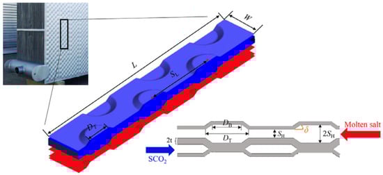 - Yao, Y.; Ding, J.; Zhang, Y.; Wang, W.; Lu, J. Heat transfer performance of pillow plate heat exchanger with molten salt and supercritical carbon dioxide. Int. J. Heat Mass Transf. 2022, 183, 122211. [Google Scholar] [CrossRef]