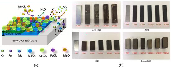 - Liu, Q.; Wang, Z.; Liu, W.; Yin, H.; Tang, Z.; Qian, Y. Ni-Mo-Cr alloy corrosion in molten NaCl-KCl-MgCl2 salt and vapour. Corros. Sci. 2021, 180, 109183. [Google Scholar] [CrossRef]