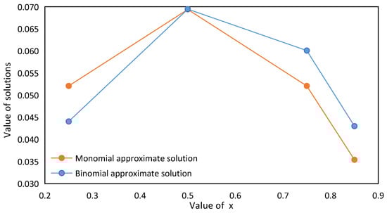 Similarly, in order to compare the approximate solutions and verify the accuracy of the Ritz approximate solution, it may be assumed that , to investigate the difference between the Ritz monomial trial solution and the binomial trial solution.