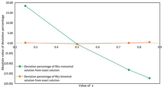 Deviation percentage of Ritz approximate solution from exact solution at different values when .