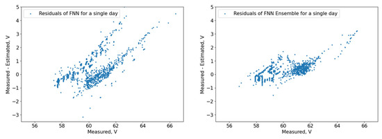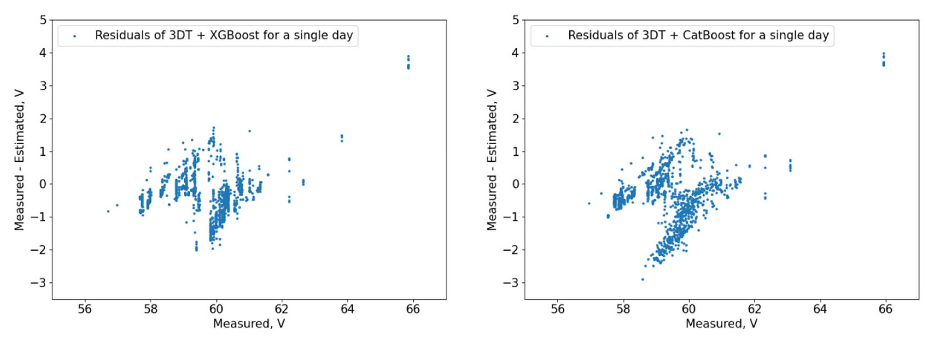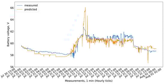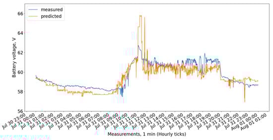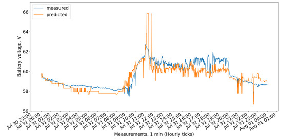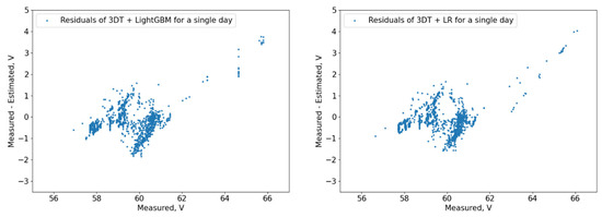 Figure 9 show the measured and predicted battery voltage, calculated for the 15-day training period correspondingly using the CatBoost, XGBoost, LightGBM, 3 DT + LR ensemble, 3 DT + CatBoost ensemble, 3 DT + XGBoost ensemble, and 3 DT + LightGBM ensemble models.