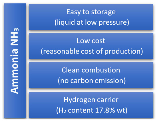 We are in times of intensive energy transformation driven by concerns about air quality. Climate change, caused by excessive CO2 emissions, contributes to numerous problems such as droughts and floods in areas where they were rare, as well as changes in flora [1]. Legal regulations enforce the reduction of fossil fuel use in favor of renewable energy sources. Internal combustion engines, due to their high efficiency in converting chemical energy from fuel into mechanical energy (for large industrial engines, it is over 50%), are still widely used in transportation, machinery propulsion, and distributed energy systems [2,3]. Decarbonization of IC engines can be achieved by using carbon-free fuels. For many years, renewable fuels such as biodiesel, alcohol fuels, biogases, and hydrogen have been used to power piston engines [4,5,6,7]. Among these fuels, only hydrogen is a clean fuel because it does not contain carbon and, thus, does not contribute to CO2 emissions. It is important to note the technology used to produce hydrogen, as it may contribute to CO2 emissions even though the hydrogen itself does not. Only hydrogen produced using renewable energy sources such as solar or wind energy can be considered truly clean [8,9,10]. There are regions in the world where renewable energy can be easily obtained and used to power hydrogen production facilities. Unfortunately, these regions are often far from the target locations where the hydrogen is needed. Thus, the hydrogen must be stored and transported to the target locations by creating a distribution network. The primary technology for producing hydrogen is the electrolysis of water. This process is quite energy-intensive but yields the purest hydrogen [11]. Hydrogen is difficult to store and transport due to its low liquefaction temperature (−240.18 °C), low density, wide flammability limits in air, and tendency to leak through container walls [12]. Storing or transporting hydrogen in liquid form requires expensive and energy-intensive cryogenic technologies. These characteristics significantly limit the widespread use of hydrogen. In recent years, attention has turned to ammonia (NH3) as a hydrogen carrier with high energy density [13]. The volumetric energy density of ammonia compressed to 1 MPa is 13.6 GJ/m3, higher than that of methane compressed to 25 MPa (10.4 GJ/m3). The hydrogen content per unit mass in liquid ammonia is over four times greater than in hydrogen stored under pressure in the form of hydrides. Ammonia can be compressed and liquefied at much lower parameters than hydrogen. Ammonia liquefies at −33 °C. Increasing its pressure by about 10 times allows it to liquefy at room temperature. Ammonia production technology and distribution networks are well-developed worldwide. A disadvantage of using NH3 as a fuel is its toxic properties and its corrosive effect on various construction materials [14]. Its main benefit lies in being a zero-carbon fuel, which allows it to be categorized as green ammonia. Figure 1 presents the main advantages of ammonia as a fuel.