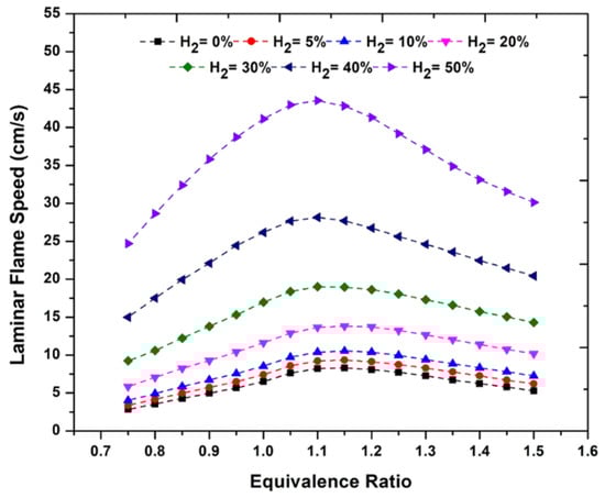 LFS of ammonia and ammonia–hydrogen mixture as a function of equivalence ratio (at 1 atm and 298 K) [52].