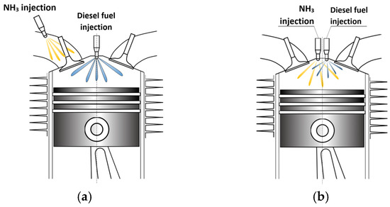 Ammonia as a fuel with properties that strongly limit its use as the sole fuel for compression ignition (CI) piston engines encourages the adoption of alternative combustion systems. The concept of dual-fuel engines has long been known and performs well for co-firing fuels with different properties [72,73]. This combustion technology is utilized for co-firing both liquid fuels [74,75] and gases [76,77]. It requires intervention in the engine’s fuel supply system and control system. The conventional CI engine fuel supply system, such as direct injection of diesel, biodiesel, or their blends, is used to deliver the igniting dose of the alternative fuel–air mixture filling the engine’s combustion chamber. Typically, the alternative fuel is introduced into the intake manifold during the engine’s intake [78,79], or in more advanced technologies, directly into the engine’s combustion chamber [80,81]. In solutions where the fuel is delivered to the intake manifold, the cylinder is filled with a fuel–air mixture, which may result in emissions of unburned fuel due to the crevice effect. The mixture during the compression stroke is pushed into crevices where combustion does not occur [82,83]. The dual-fuel injection system can mitigate the crevice effect. The properties of ammonia as a fuel encourage the use of dual-fuel technology for its combustion in piston engines. Hydrogen is most commonly used as an assisting fuel to enhance flame propagation in the combustion chamber, but there are also other proposals for partially combusted fuels with ammonia.
