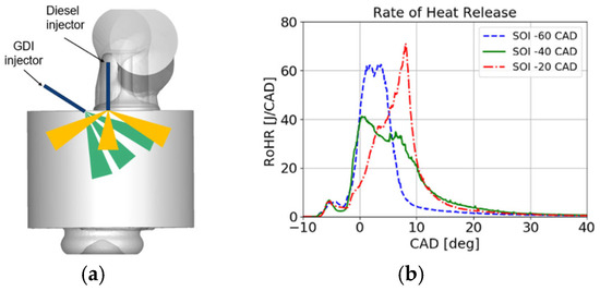 Direct injection both diesel fuel and NH3: (a) injection diagram, (b) influence of NH3 injection start angle on HRR [97].