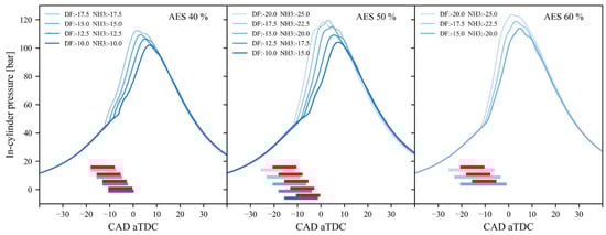In-cylinder pressure curves for different combustion phasings at three ammonia energy fractions (AEF) of 40%, 50%, and 60%. Red lines represent the diesel fuel injection timing, while blue lines indicate the NH3 injection timing [96].