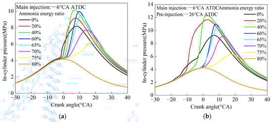 Pressure profiles in the cylinder of an ammonia-powered engine with direct injection of diesel fuel with a single dose (a) and pilot injection (b) [99].