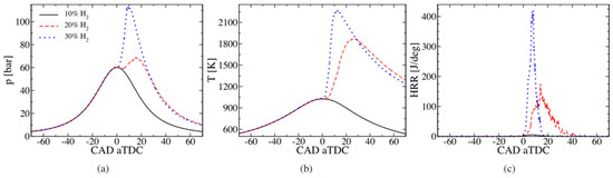 Figure 6 presents the simulation study results of the impact of ammonia share AEF 0–80% and injection strategy [99]. Figure 6a shows the influence of AEF at a constant start of injection angle of the diesel pilot injection. It was found that up to 40% NH3 share resulted in an increase in pmax pressure, while for higher NH3 shares, pmax pressure began to decline. Lower NH3 shares shifted the diffusive combustion phase to kinetic combustion, generating greater pressure increases, whereas for higher AFRs, above 40%, the dominant phenomenon was the cooling effect of ammonia. A higher NH3 share also corresponded to a lower diesel fuel dosage, emphasizing the dominance of ammonia combustion, which has a low LFS value, thereby slowing down the combustion process.