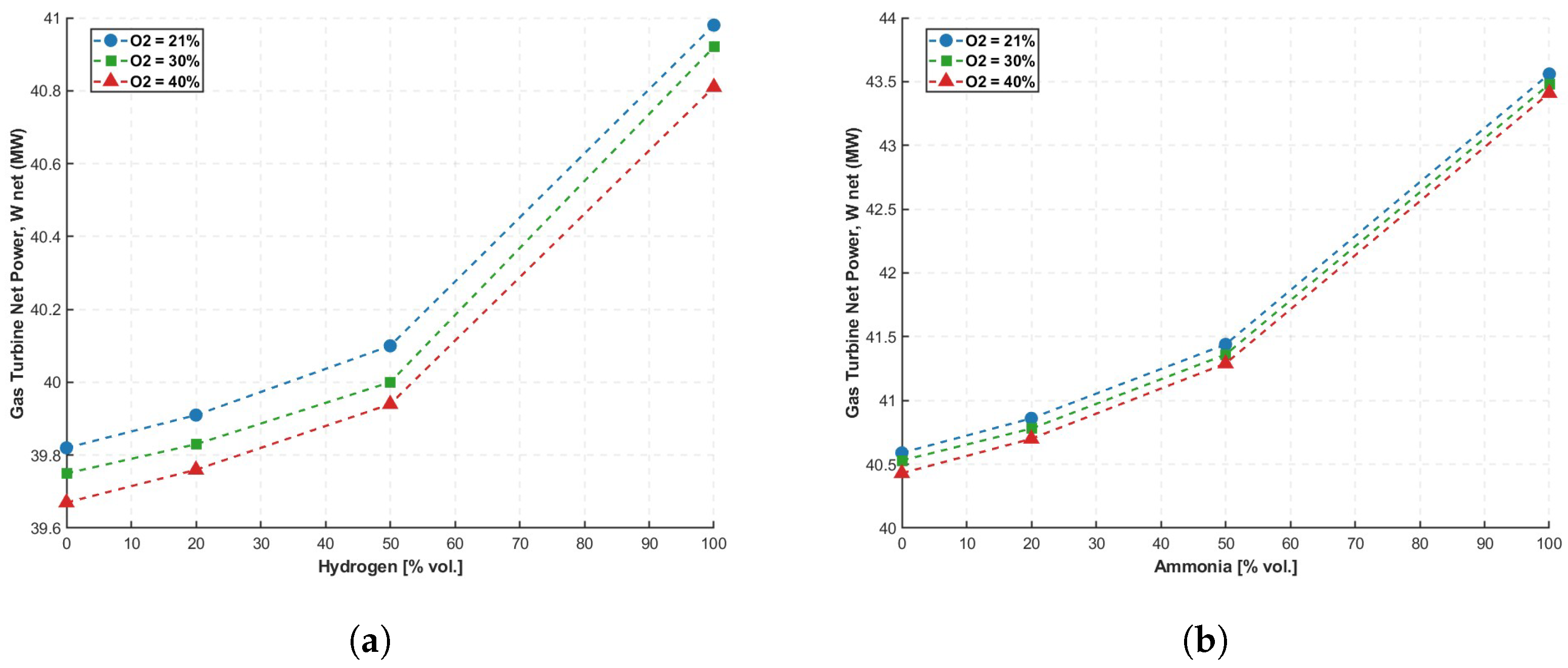 Performance decreases when the air’s oxygen content increases because the turbine inlet temperature (TIT) remains constant at 1723 K, which requires reducing the equivalence ratio. The values increase slightly from 39.82 MW at 0% to 40.98 MW at 100% at 21% , and 40.84 MW at 100% at 40% . This behavior is due to the higher calorific value and flame temperature caused by the added hydrogen, which improves combustion and increases energy extraction from the fuel, raising .