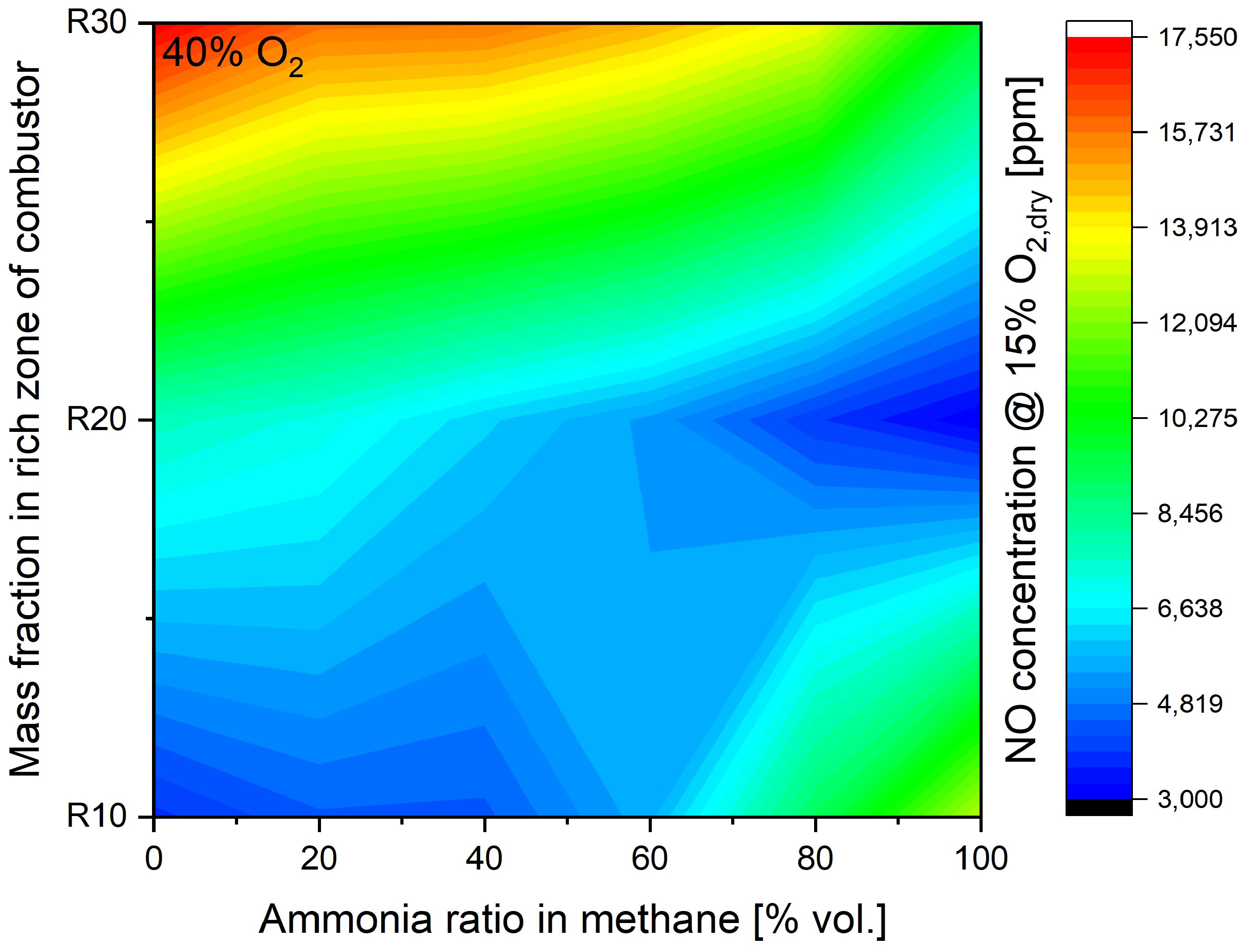 The distribution of the oxidizer has a major effect on the trend in emissions, with = 40% vol. Rising emissions are caused by raising the / ratio at low oxygen availability in the reaction zone (R = 10 wt.%). In contrast, the reverse trend is seen for R = 20 wt.% and 30 wt.%, when emissions fall as the ammonia content rises.