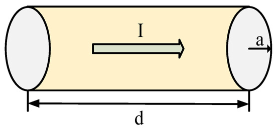 Cook, Roberts et al. considered that the plasma channel has the following characteristics: the thickness of the channel boundary layer is much smaller than the radius of the channel, and the temperature and pressure in the plasma channel can be considered to vary uniformly. Therefore, this report refers to Kratel’s proposal to regard the discharged plasma channel similarly to the cylindrical plasma channel model, which is convenient for computational analysis [35,36,37]. The simplified channel model is shown in Figure 2, where a is the plasma channel radius from dielectric breakdown, d is the axial length of the conduction path, and I is the total current through the ionized channel.
