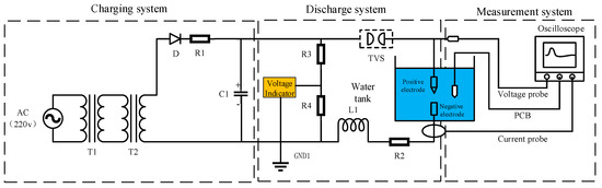 Applying a high-voltage pulse across liquid-submerged electrodes induces dielectric breakdown, creating a conductive plasma channel between them, and the strong electric field established between the electrodes ionizes the liquid molecules, forming a low-impedance conductive path on the order of microseconds [28,29]. The electric energy accumulated in the storage capacitor is instantaneously released through the plasma channel, which triggers intense Joule heating and electromagnetic contraction effects, leading to a rapid expansion of the gas inside the channel. This rapid expansion process forms a high-pressure impulse wave in the surrounding liquid, and this physical mechanism is called the liquid–electric effect, which is an important basic theory for the generation of an impulse wave from an impulse sound source [30,31,32].