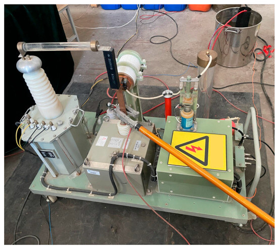 The pulse energy storage capacitor charging system consists of a voltage regulator, voltage booster, current-limiting resistor, silicon rectifier stack, and pulse capacitor. The charging process for the utility 220 V operates through the T1 regulator and T2 booster, and through the silicon pile D rectifier to charge the pulse energy storage capacitor C1; the charging system work is complete after the capacitor reaches the working voltage. The electrode discharge system includes a voltage divider resistor, a voltage display, a high-voltage discharge switch TVS, two electrodes, a water tank, an equivalent inductive component L1, and a resistive component R2. Through the voltage divider (attenuation ratio 2500:1), the capacitor’s potential difference is visualized on the display, constituting the charging voltage circuit check and monitor. By controlling the trigger switch to make the TVS conductive, when the capacitor’s stored high voltage is suddenly discharged through the liquid-immersed electrode, a gap breakdown occurs; at this time, the electrical energy stored in the pulse energy storage capacitor C is instantly released in the electrode gap, resulting in the formation of a complex impulse wave discharge process in the liquid. The measurement system employs a Tektronix P6015A (Beaverton, OR, USA) high-voltage probe for electrode gap potential measurement, a Pearson 1330 (Pearson Electronics, Palo Alto, California, USA) current probe for discharge current monitoring, and a PCB W138A01 (PCB Piezotronics, Buffalo, NY, USA) pressure sensor positioned 0.17 m from the gap center to quantify impulse wave intensity. The PCB pressure sensor was calibrated at 22 degrees Celsius, 46% humidity, and an input range of 200–1000 PSI (in steps of 200 PSI), and the calibrated pressure sensor possessed a better linear relationship, which increased the accuracy of the measured data. All signals are captured and stored using a digital oscilloscope. According to the schematic diagram of the impulse acoustic discharge experimental system shown in Figure 4, the impulse sound-source electrode discharge experimental system was constructed, as shown in Figure 5.