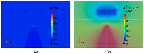 The transient characteristics of the impulsive acoustic source needle–plate electrode breakdown obtained from the numerical simulations are shown in Figure 7: (a) temperature field distribution during the breakdown phase and (b) spatial gradient of the potential field at the corresponding moment. At 575.44 µs, the temperature is 781 k and the voltage is 11.1 kV; the field strength averaged over the gap is calculated to be 15.86 kV/cm, and according to the judgment condition of the electrode breakdown, the needle–plate electrode breaks down, so the pre-breakdown time is 575.44 µs.