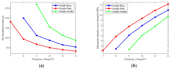 Based on the calculation, the electroacoustic characteristics of the needle series electrodes at different charging voltages are shown in Figure 9. Figure 9a–e show the influence laws of charging voltage on the pre-breakdown time, maximum impulse wave intensity, maximum system power, maximum sound pressure level, and electrode electroacoustic conversion efficiency for the needle series electrodes.