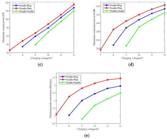 Electroacoustic characteristics of the needle series electrodes at different charging voltages: (a) pre-breakdown time; (b) maximum impulse wave intensity; (c) maximum system power; (d) maximum sound pressure level; (e) electroacoustic conversion efficiency.