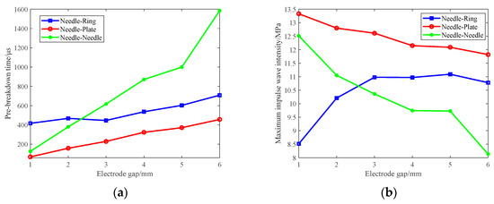 Systematic simulation calculations show that the needle electrode and plate electrode structures act synergistically to provide the best electroacoustic parameters compared to the needle–ring and needle–needle electrode structures. Furthermore, under different electrode gaps, the smaller the electrode gap, the more favorable for the needle–plate electrode excitation. Compared with the 6 mm and 1 mm electrode gaps, the pre-breakdown time is shortened by 387.8 µs, the maximum impulse wave intensity is increased by 1.51 MPa, the maximum sound pressure level is improved by 1.3 dB, and the electroacoustic conversion efficiency is increased by 0.984%. Therefore, a smaller electrode gap is favorable for needle–plate electrode excitation.