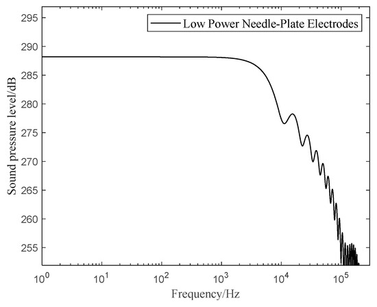 Low-power impulse sound-source needle–plate electrode sound pressure-level frequency plot.