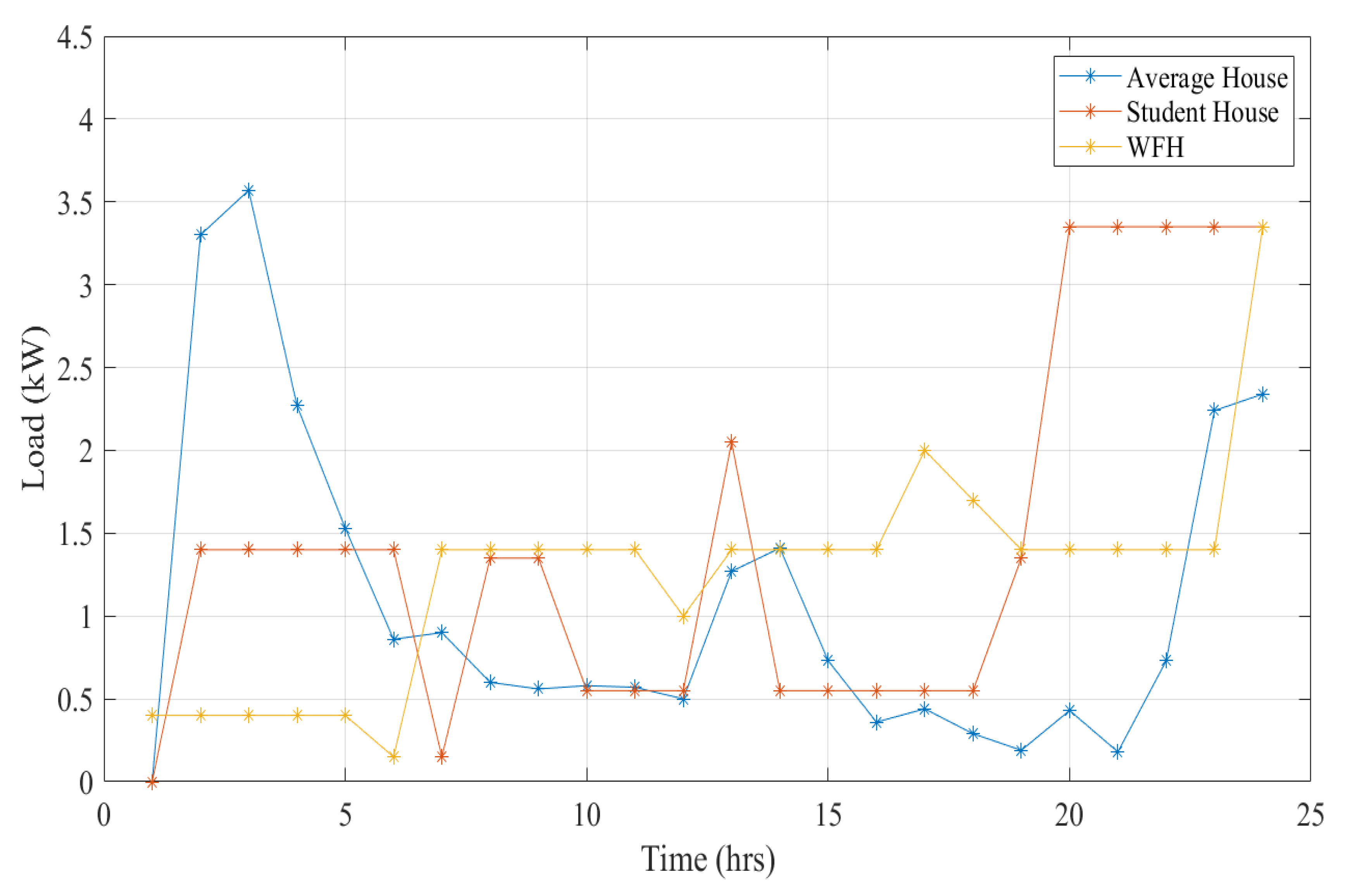 Figure 4 illustrates the load profiles of the three house types: high-load houses (work-from-home households), medium-load houses (average households), and low-load houses (student households). The homes are classified into these categories as follows: houses 3, 6, and 9 are high-load; houses 1, 4, 7, and 10 are medium-load; and houses 2, 5, and 8 are low-load. The load data are based on [