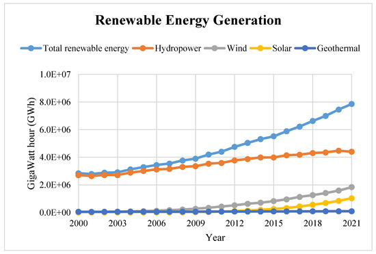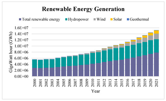 Yet, heterogeneity across renewable technologies and institutional contexts complicates this general finding (Figure 1 provides an overview of global trends in renewable energy generation, illustrating the scale of renewable expansion over time). Ref. [5] conducts a panel analysis of 15 major renewable-energy-consuming economies and reveal that while some renewables (e.g., hydropower) consistently correlate with lower CO2, others (e.g., wind and solar) occasionally exhibit positive or insignificant associations with emissions—particularly in nations where grid integration challenges and regulatory frameworks remain underdeveloped. They argue that in upper-middle-income countries, rapid wind and solar deployment without adequate grid flexibility can result in increased reliance on fossil-fuel “peaking” plants during low-renewable periods, yielding a net uptick in CO2 [5]. This study builds on this insight by expanding the country sample to 184 nations (2000–2020) and disaggregating renewables into hydropower, wind, solar, and geothermal, thereby testing whether Saidi and Omri’s heterogeneity holds at a truly global level.
