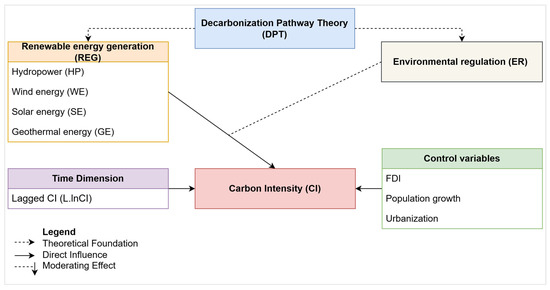 That is to say, the inclusion of this lag-dependent variable is both theoretically and empirically justified. Carbon intensity is not expected to adjust instantaneously to changes in renewable energy penetration or other influencing factors. Instead, it exhibits persistence over time due to technological inertia, infrastructural rigidity, policy implementation delays, and behavioral adaptation processes. This aligns with the decarbonization pathways theory, which suggests that transitions in energy systems and emission trajectories develop gradually and are influenced by historical legacies or path dependence (see Figure 2).
