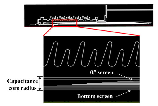 Under the dual requirements of addressing field strength safety and process suitability, the inter-screen voltage distribution is coordinated with the partial discharge inception voltage to ensure that the bushing’s insulation structure and material properties align with operational conditions. A design methodology employing uniform thickness with graded steps is implemented, where axial field strength is maintained below permissible limits by regulating umbrella-step and tail-step differentials to control step dimensions, thereby achieving sufficient insulation design margins. The 40.5 kV, 72.5 kV, and 126 kV bushings incorporate 7, 8, and 10 capacitive grading screens, respectively. The simulation model of the 126 kV bushing, as illustrated in Figure 2, serves as a representative example. The dimensions of bushing screens for three different voltage levels of bushings are shown in Table 1.
