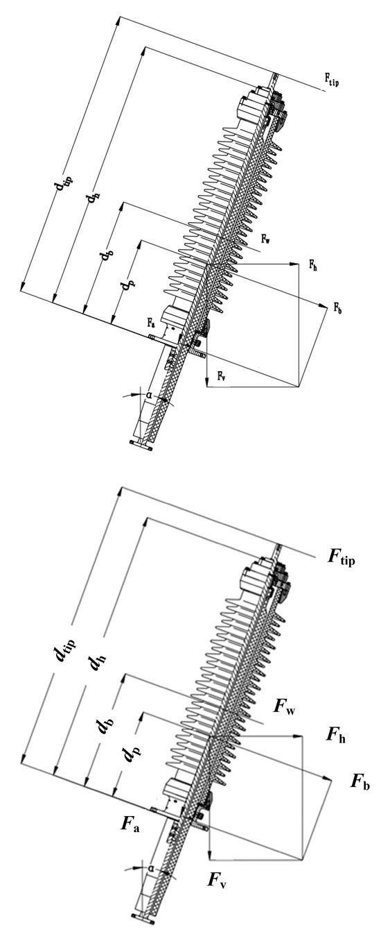 According to IEC TS 61463 [18], the seismic capability of bushings is verified by primarily assessing whether the failure torque of the fiberglass tube at its critical section can meet (exceed) the total bending moment occurring during an earthquake (which includes bending moments caused by seismic loads, wind loads, and terminal loads). The seismic calculation diagrams for bushings of different voltage levels are illustrated in Figure 3.