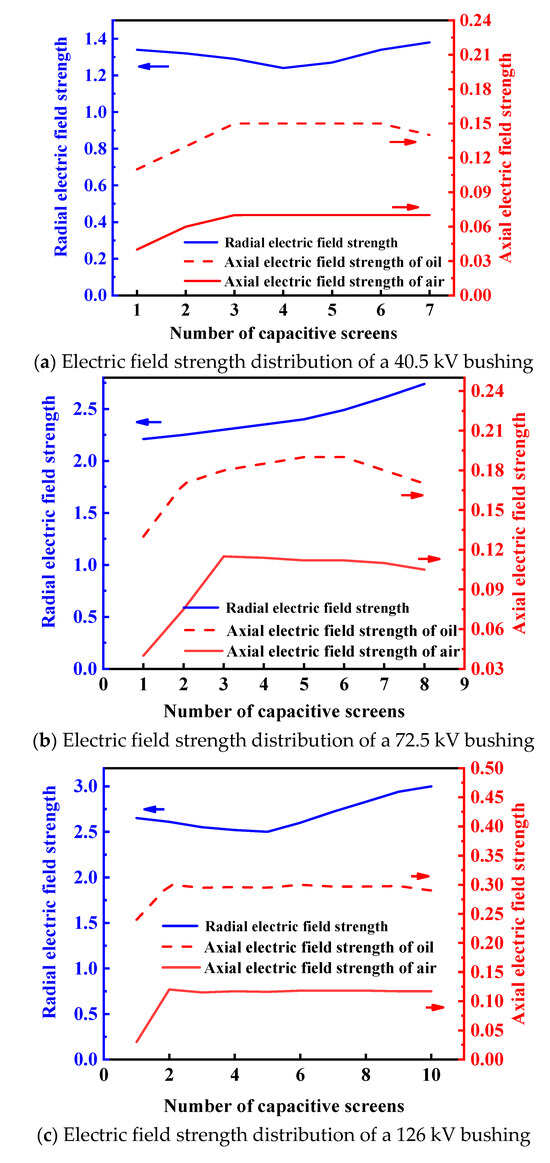 In this study’s design of the epoxy core, the outer diameter of the 40.5 kV bushing core is selected as 92 mm with 7 layers of capacitor screens; the outer diameter of the 72.5 kV bushing core is 116 mm with 8 layers of capacitor screens; and the outer diameter of the 126 kV bushing core is 130 mm with 10 layers of capacitor screens. The radial and axial electric field strengths of the epoxy core in the three different bushings were simulated and calculated, with the simulation results shown in Figure 4.
