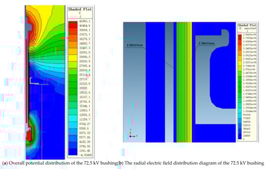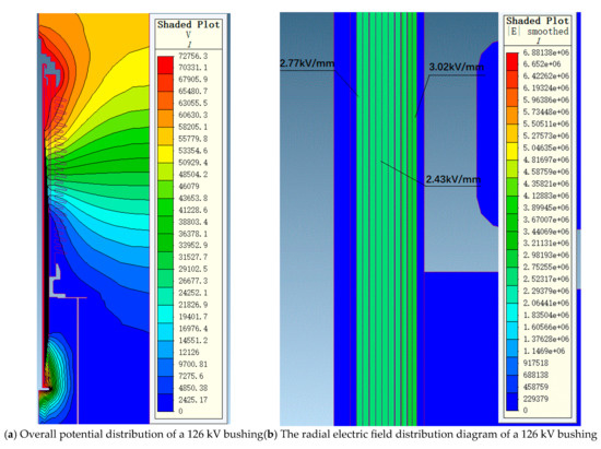 Using the finite element simulation method, the terminal electric field simulation of 72.5 kV and 126 kV bushings under power frequency voltage was conducted. For the 72.5 kV and 126 kV bushings, we applied 155 kV and 255 kV power frequency voltages, respectively, to calculate their electric field distributions. These voltage levels were selected in accordance with IEC 60137:2017.