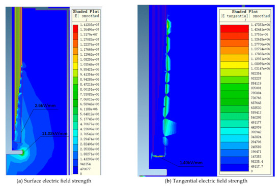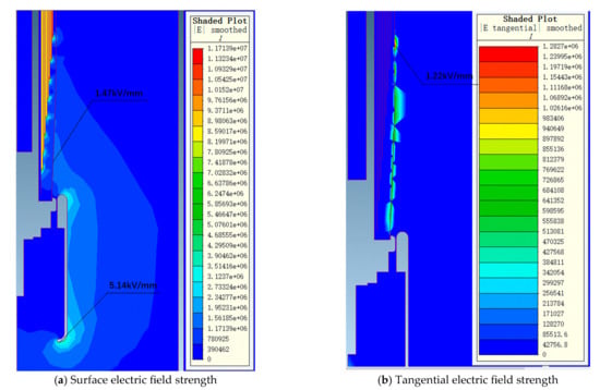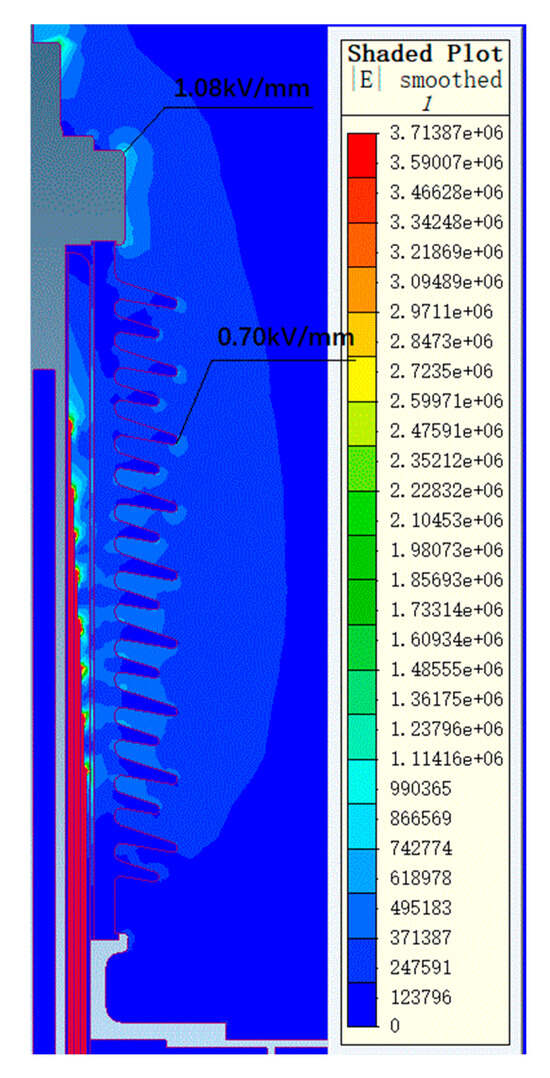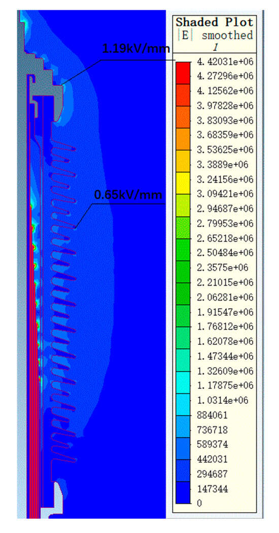Figure 7 and Figure 8 show the electric field distribution diagrams of the air end and transformer end of the 72.5 kV bushing under a power frequency voltage of 155 kV. Figure 9 and Figure 10, respectively, display the electric field distribution diagrams of the air end and transformer end of the 126 kV bushing under a power frequency voltage of 255 kV.
