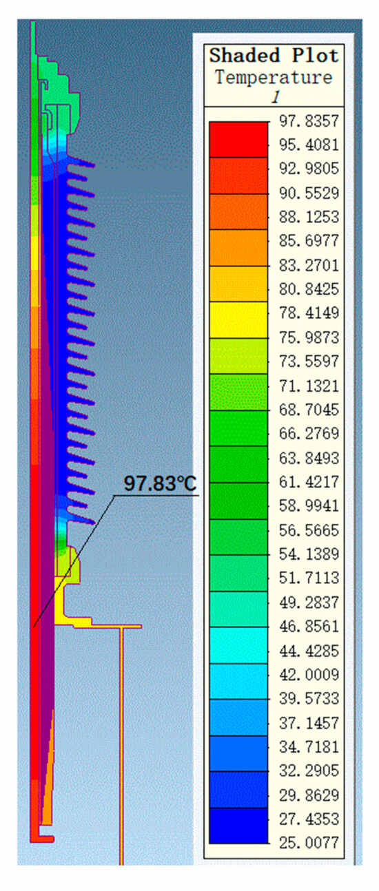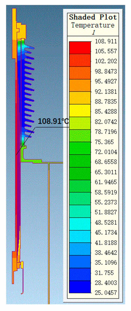 Through thermal field simulation, the current-carrying designs of bushings at different voltage levels were verified. Simulation parameters were set based on the actual operating conditions of bushings at different voltage levels. For the 72.5 kV bushing, the oil temperature was set to 85 °C, the air end to 25 °C, and the current was set to 2000 A for the simulation. For the 126 kV bushing, the oil temperature was set to 85 °C, the air end to 25 °C, and the current was set to 1250 A for the simulation. The maximum temperature of the conductor was 120 °C, which is stipulated by the standard GB/T 4109-2022 [19]. The overall temperature distributions for the 72.5 kV and 126 kV bushings are shown in Figure 11 and Figure 12, respectively.