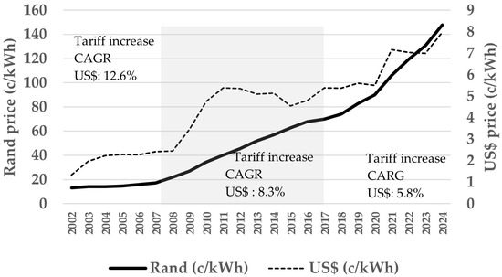 - Eskom Tariff History. Available online: https://www.eskom.co.za/distribution/tariffs-and-charges/tariff-history/ (accessed on 16 April 2024).
