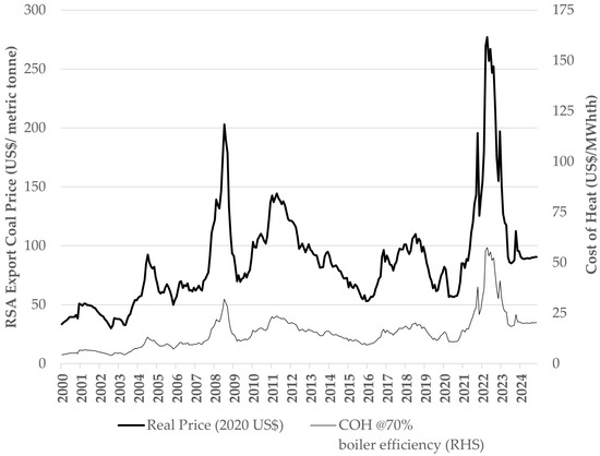 The perceived high costs of transitioning to cleaner technologies often deter industries from making the switch. Real-term or inflation-adjusted export coal prices, presented in Figure 3, show the price recovery following the 2022 European energy crisis [21]. If price volatility had persisted, a greater impetus would have existed to find alternative energy sources to meet process heat requirements. However, that is not the case. While the impact of carbon taxes has been diluted through discounts and allowances, from 2026 onwards, price pressures are expected to intensify, with the differential between European and South African coal prices likely to reduce [35,36].
