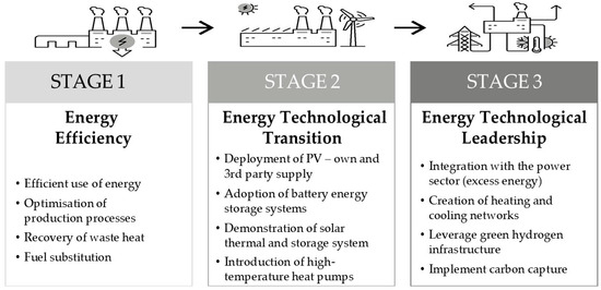The industrial sector dominates global energy usage, accounting for approximately 50% of total energy demand, with process heat representing two-thirds of this consumption. Although renewable energy technologies have become increasingly cost-competitive, industrial users have been hesitant to replace fossil fuels to meet heat generation requirements. This study presents a practical framework for industrial energy transition, proposing a phased approach toward sustainable manufacturing practices, processes, and energy technologies. The framework emphasises that while energy efficiency measures form the foundation, strategic technological investment priorities should target the replacement of fossil fuels with sustainable and renewable energy technologies. The formulation of the three-phased energy technology advancement framework is informed by techno-economic analyses across a range of technical interventions available to plant operators, namely beverage manufacturers. For South African conditions, cost–benefit analyses suggest that the industry will prioritise investments in photovoltaic and battery energy storage systems, driven by attractive returns on investment, which are expected to improve. However, sustainability plans and efforts must extend beyond immediate financial returns, particularly in terms of future space requirements and capital allocation. This more holistic approach will ensure long-term sustainability while meeting increasingly stringent environmental commitments.