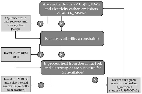 The primary investment criterion for companies in free-market environments is to create value through accurate valuation of acquisition targets or project investments using net present value analyses [39]. A positive net present value is obtained when the investment return on capital exceeds the weighted average cost of capital, ensuring that risks and uncertain outcomes are factored into future cash flows [45]. This research presents a simplified Year-1 return on investment to analyse the relative cost-benefits of alternative options. While the insights were obtained from modelling returns at a representative South African beverage facility, using hourly heat demand and irradiation profiles for representative plants located in Johannesburg and Cape Town, decisions were framed more generally to allow a broader group of industrial users to assess renewable energy investment priorities. The decisions were then ranked and ordered to deliver a logical set of choices and associated outcomes, as presented in a decision tree in the discussion section.