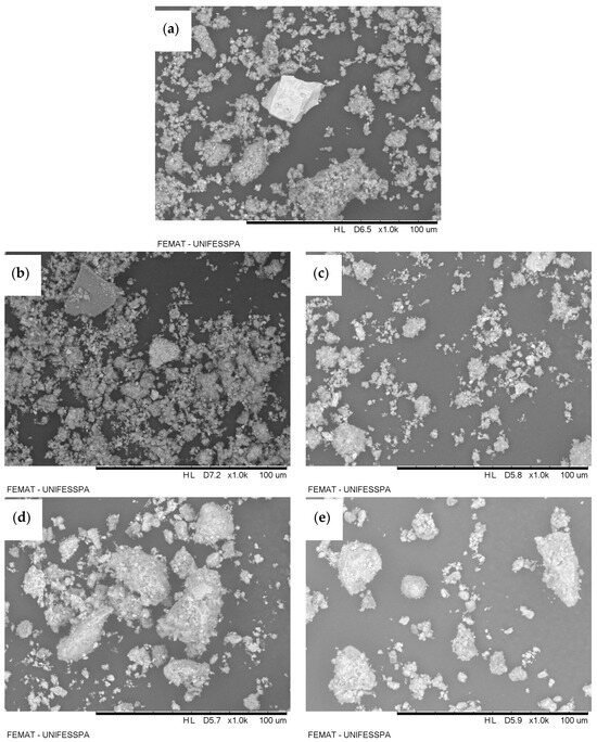 Figure 1 presents the micrographs obtained by scanning electron microscopy (SEM) for the different samples of red-mud-based adsorbents: red mud (without activation) (Figure 1a), TARM at 400 °C (Figure 1b), TARM at 600 °C (Figure 1c), CARM-0.25M HCl (Figure 1d), and CARM-2M HCl (Figure 1e). The analysis of these images reveals particle clusters in all samples, suggesting a heterogeneous particulate structure characteristic of red-mud-based materials, as reported by Antunes et al. [41]. It was observed that, for the magnification used, both thermal and chemical activations did not result in visible morphological changes in the treated samples (Figure 1b–e) compared to the original red mud (Figure 1a), corroborating the findings of Antunes et al. [41] for thermal activation. The results from thermal activation suggest that the effectiveness of carboxylic acid adsorption is not necessarily dependent on evident morphological changes; rather, it appears to be more closely related to properties such as increased surface area, particularly for the thermal activation at 400 °C, as detailed in Section 3.1.4. However, Figure 1d,e, which show the HCl-activated samples, suggest features such as spherical particle formation and greater connectivity between the pores, consistent with the observations of Fang et al. [42]. According to Fang et al. [42], these modifications provide a larger specific surface area, with more reactive sites, which contributes to the improvement in the adsorption efficiency of the material.