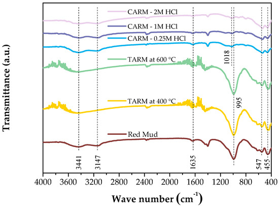Figure 2 shows the FTIR spectra of the red-mud-based adsorbents (Red Mud, TARM at 400 °C, TARM at 600 °C, CARM-0.25M HCl, CARM-1M HCl, and CARM-2M HCl), revealing the presence of different metal oxides, such as Fe2O3, Al2O3, SiO2, CaO, Na2O, and TiO2. The peak detected around 3440 cm−1 can be attributed to the stretching vibrations of the hydroxyl groups in adsorbed water and the OH metal groups present in all samples, in agreement with the results of Fang et al. [42]. Additionally, the band around 1630 cm−1 confirms the presence of H2O molecules bound to the aluminosilicate structure in the non-activated red mud and its modified forms, in line with findings reported in the literature on the common association of water in adsorbent structures based on or not based on red mud.